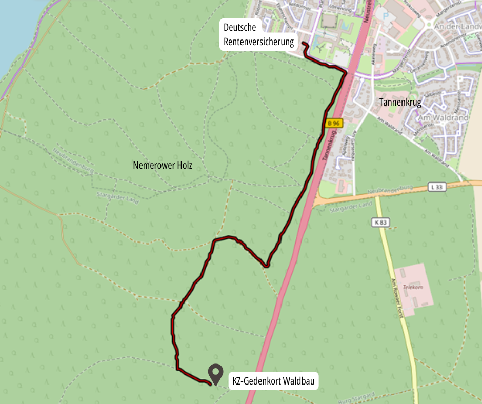 Über den Ufer-Radweg, der um den Tollensesee führt, gelangt man über Waldwege zum KZ-Gedenkort. Von Neubrandenburg kommend nimmt man dafür die Abzweigung nach dem Chimborazo nach links.