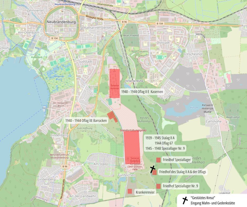 Das Gelände der Mahn- und Gedenkstätte Fünfeichen umfasst den Friedhof des Kriegsgefangenenlagers, zu welchem das Stalag IIA, Oflag II E und Oflag 67 gehörten, sowie die Friedhöfe des NKWD-Speziallagers Nr. 9. An die Verstorbenen beider Lagerepochen wird über Namenstafeln erinnert.